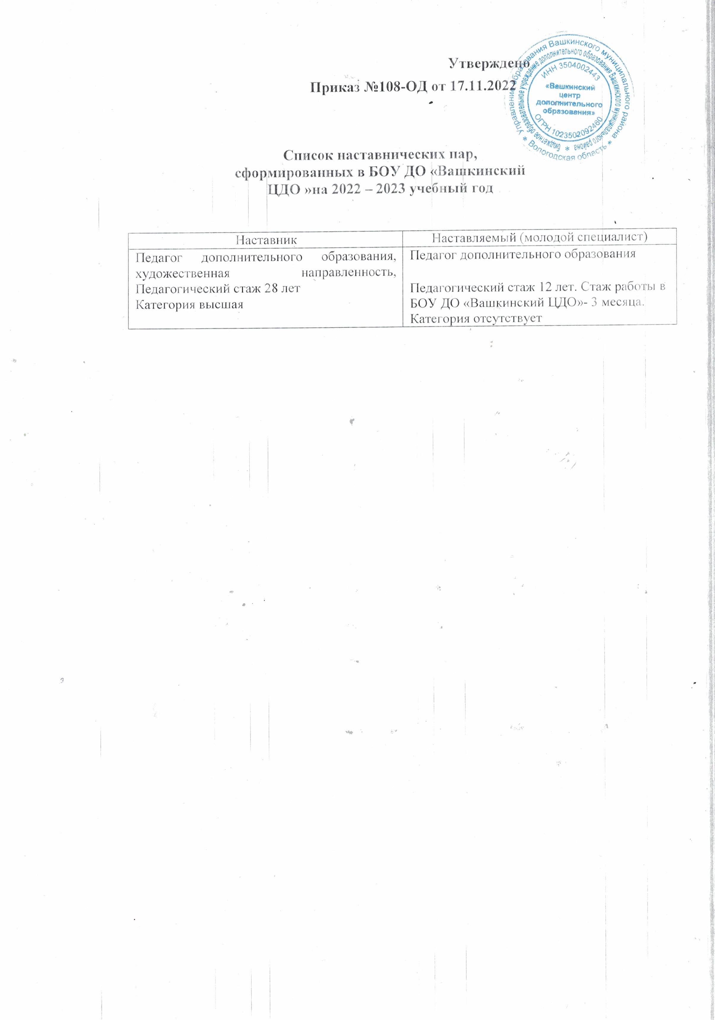 Список наставнических пар, сформированных в БОУ ДО "Вашкинский ЦДО" на 2022-2023 учебный год